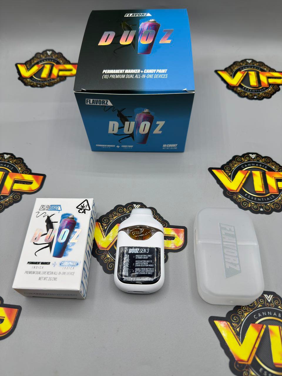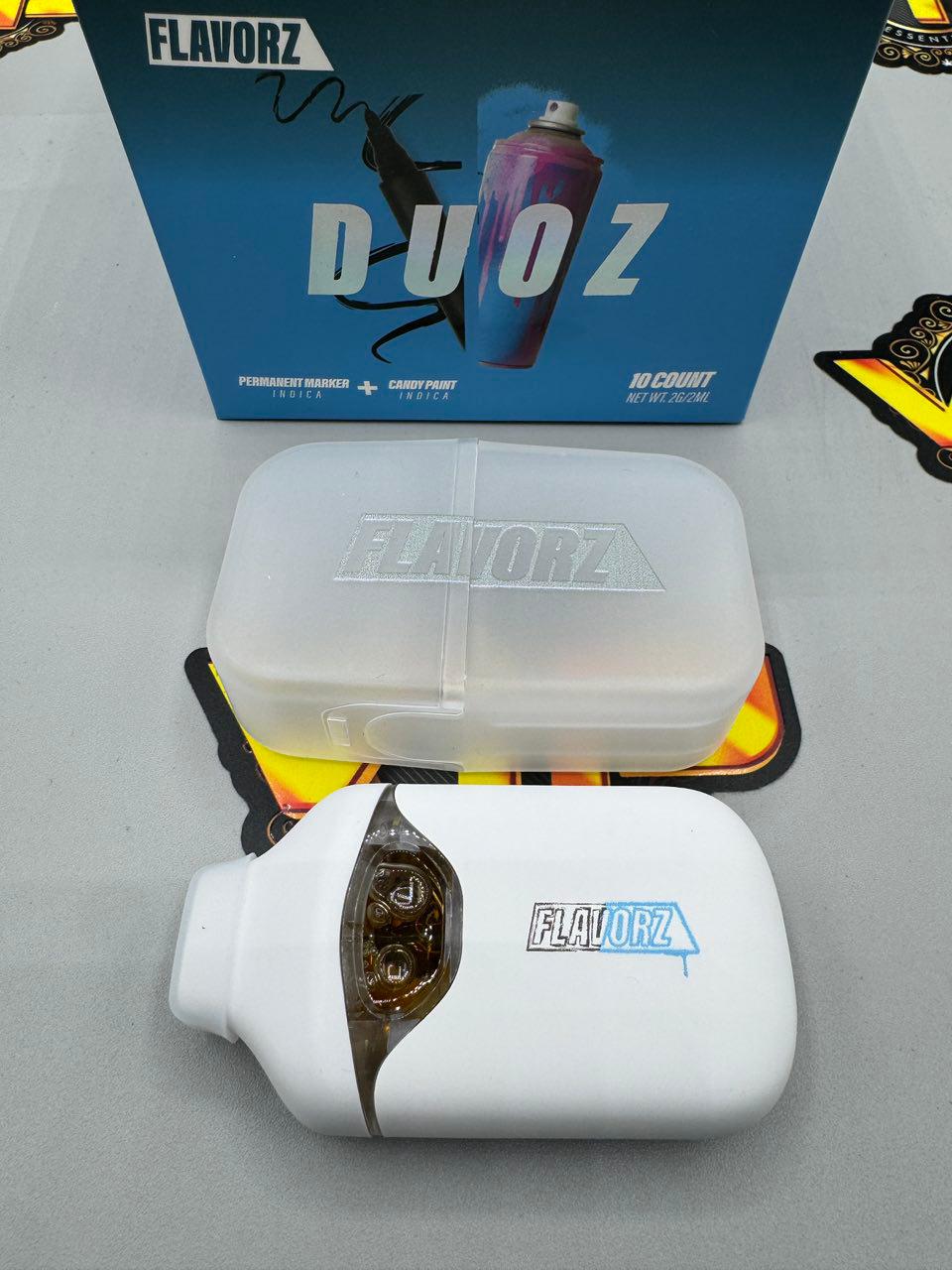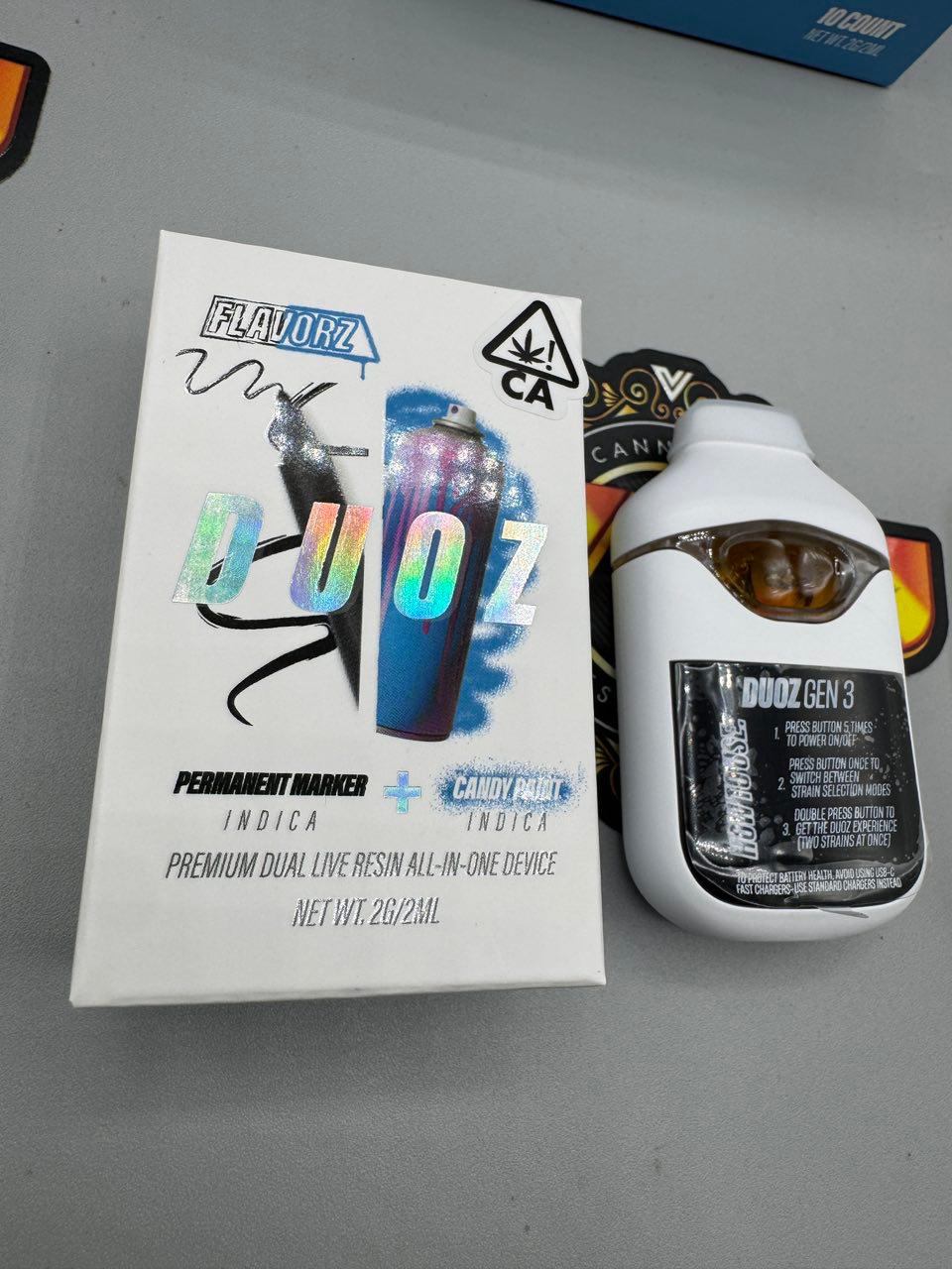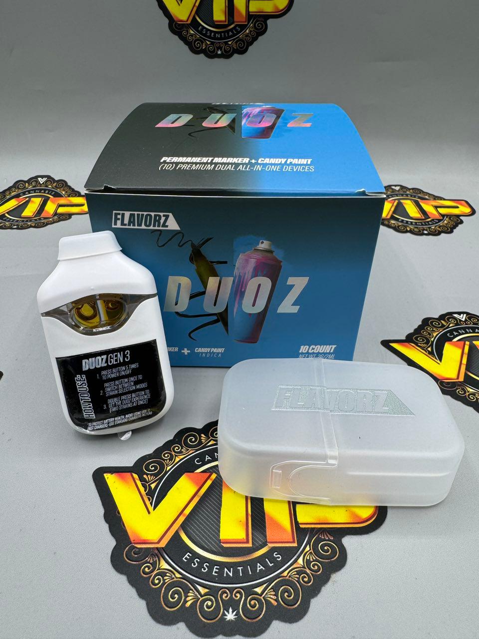 The Flavorz Duoz Gen 3 is a premium dual-chamber disposable vape that contains two separate live resin strains in one device. It allows users to vape each strain individually or activate Duoz Mode to enjoy both strains at the same time.