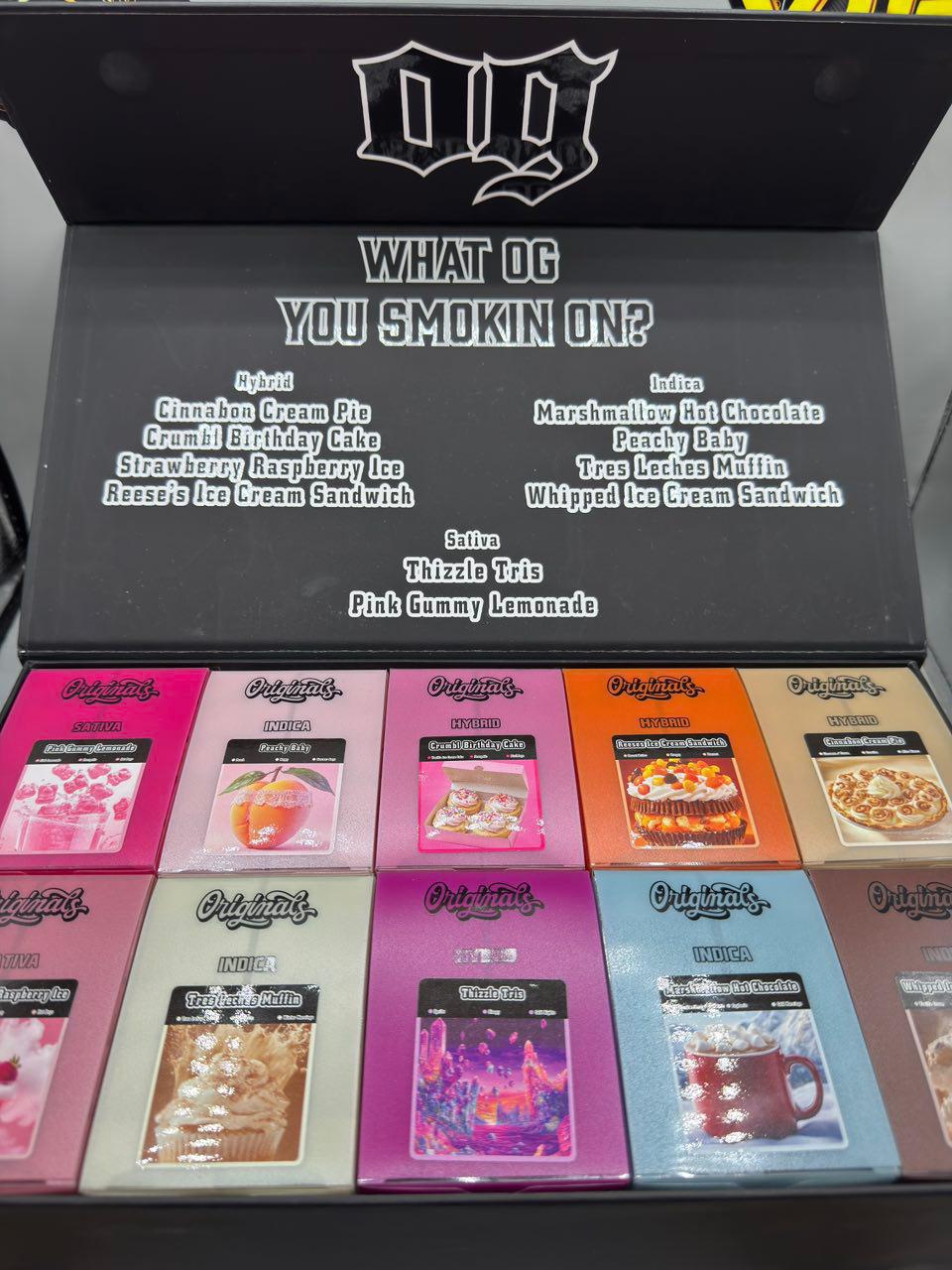 Originals offers rotating selections including Blue Dream, Grandaddy Purple, Sour Diesel, Gelato, OG Kush, and Pineapple Express, among others.